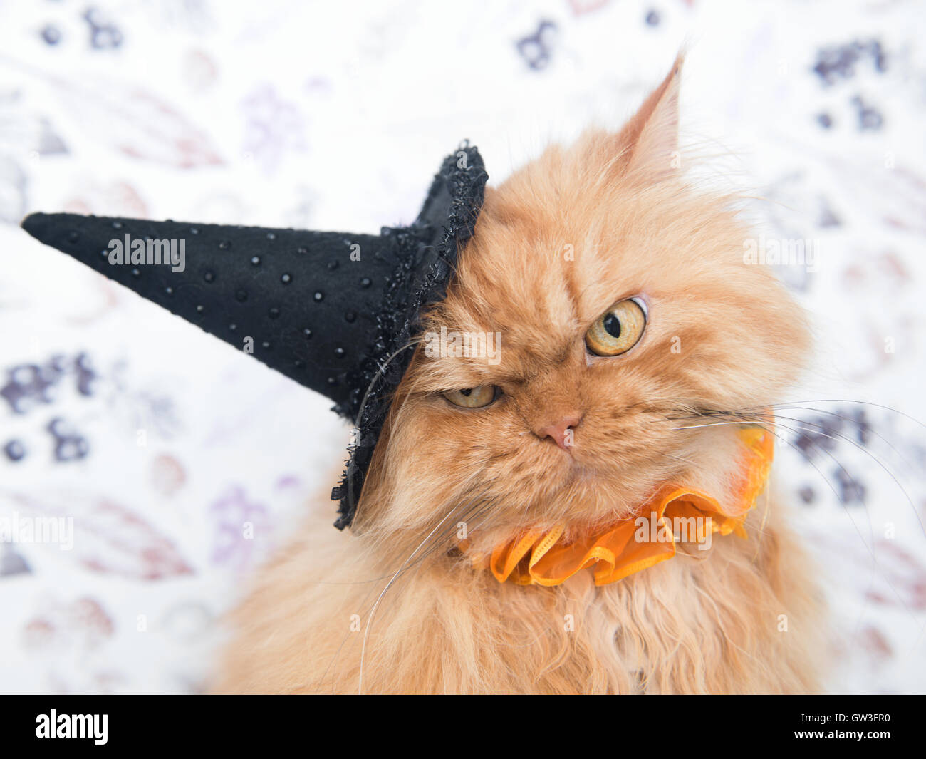 Orange Persian Cat With Halloween Witch Cat Hat Stock Photo Alamy